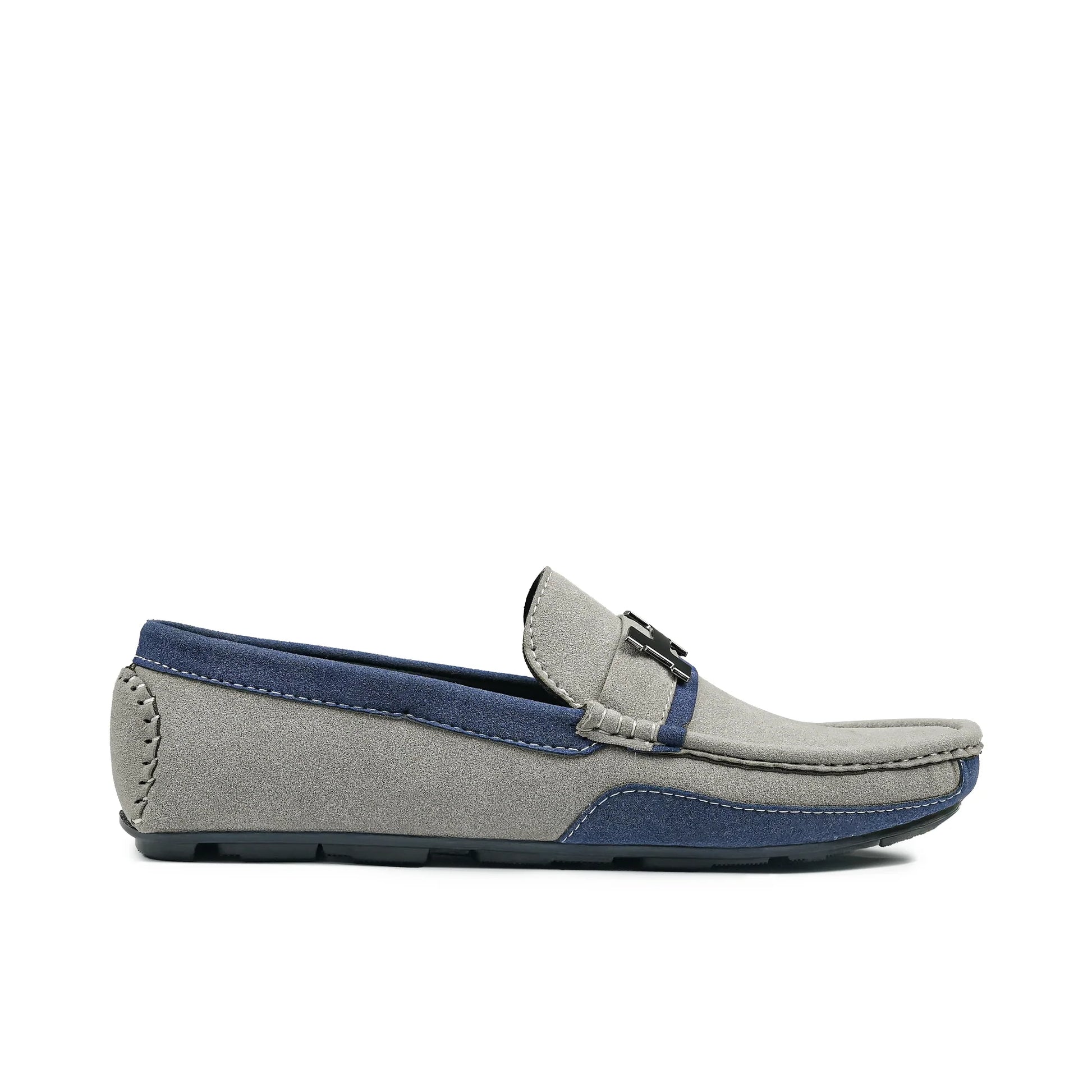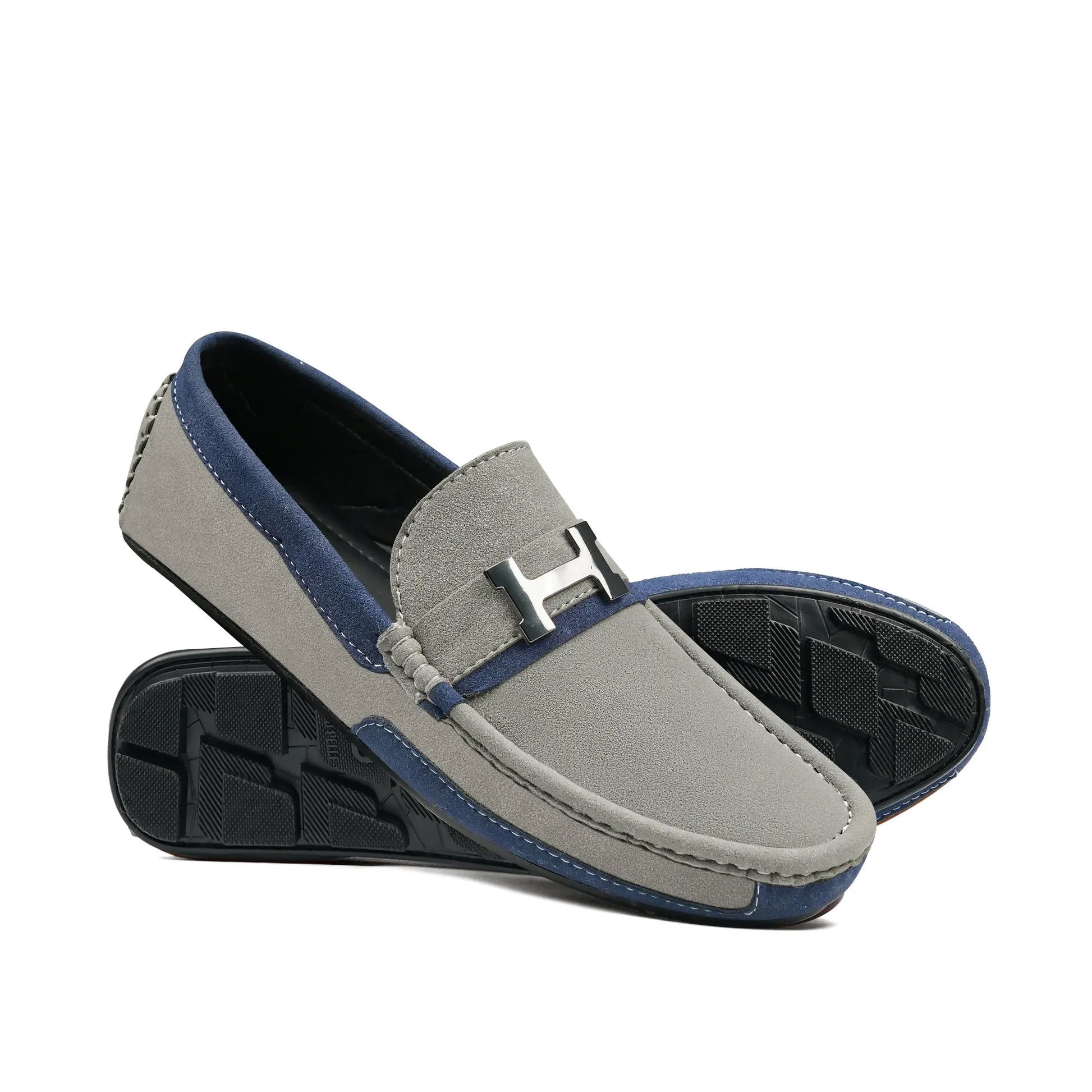 Upgrade your footwear collection with these premium dual-tone loafers crafted for modern elegance and comfort. The sleek combination of grey and navy blue suede gives a sophisticated look that suits both casual and formal settings. Highlighted by a polished metal H-buckle, these loafers are designed to stand out while maintaining an understated charm. With durable, anti-slip rubber soles and plush interiors, they offer all-day comfort and confidence for every step.