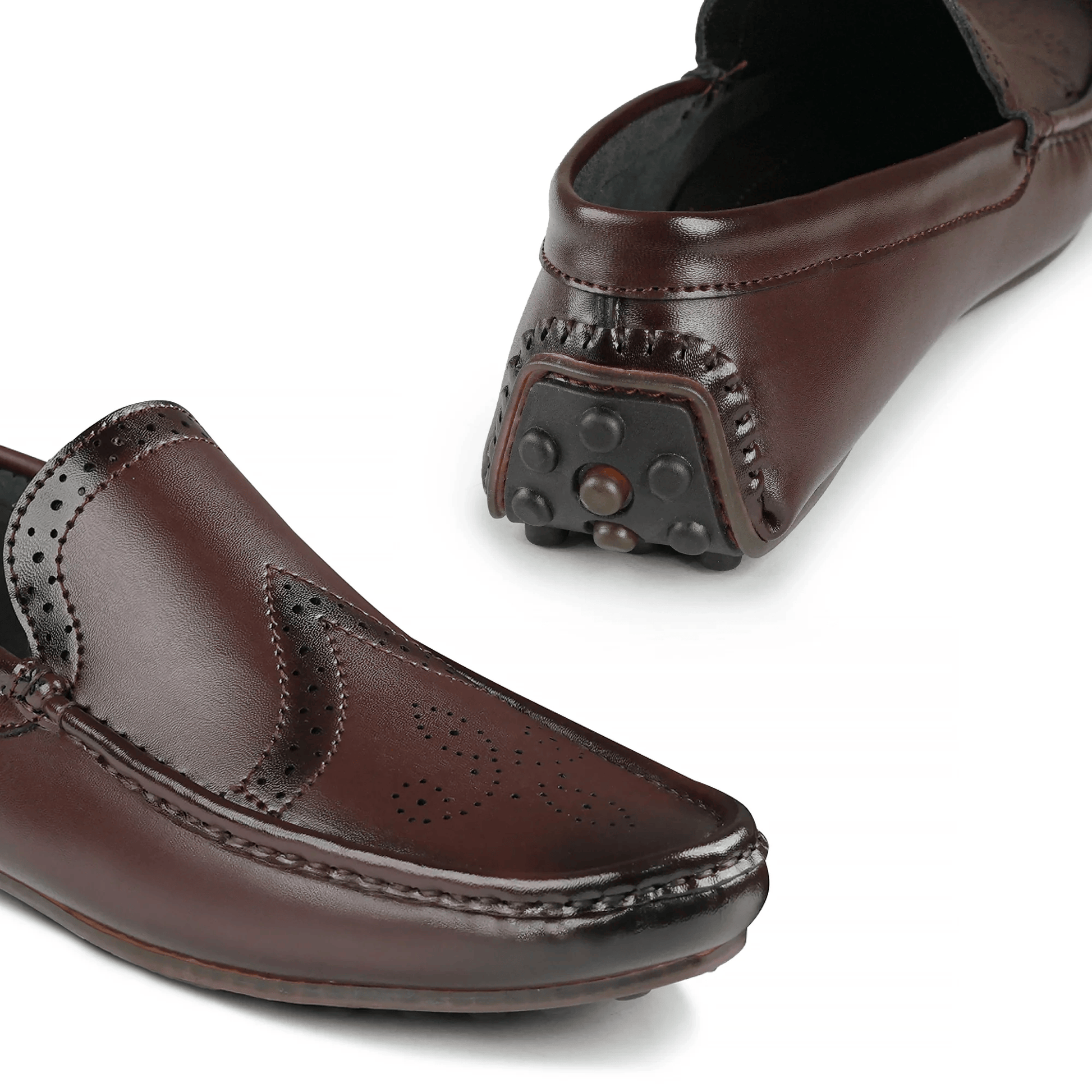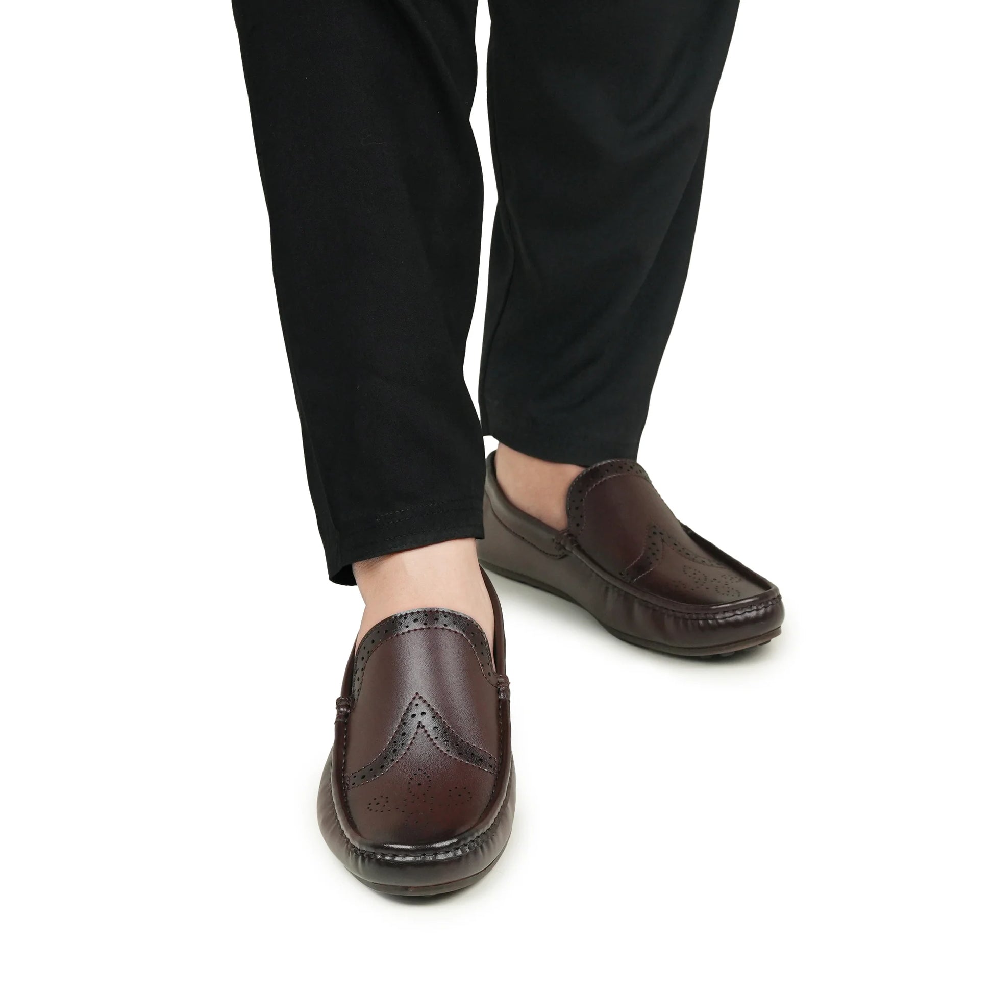 These stylish perforated leather loafers are crafted for the modern man who values both fashion and comfort. Made from premium brown leather, these loafers feature a refined design with subtle perforations for added breathability. The black accent on the upper provides a touch of sophistication, making them ideal for both casual and semi-formal occasions. The rubber sole with raised grips ensures excellent traction and durability, providing a comfortable walking experience.