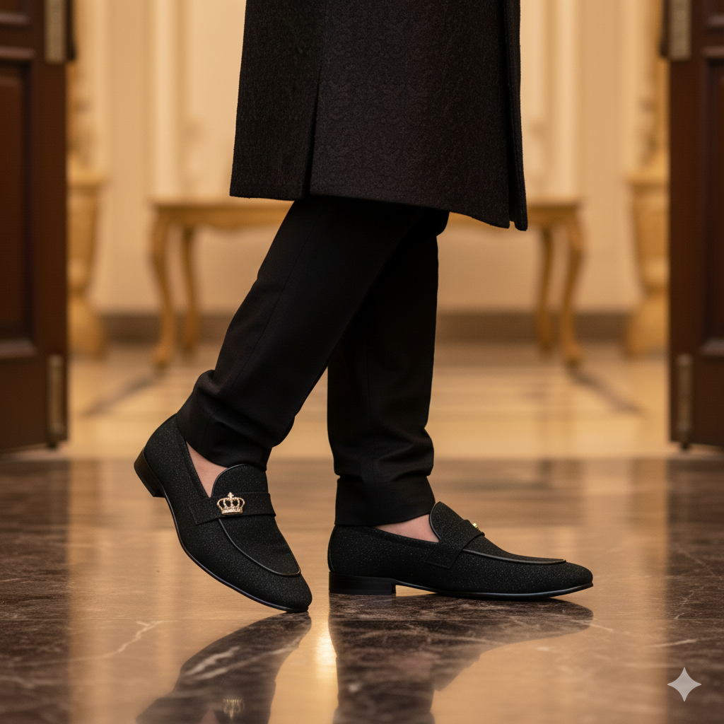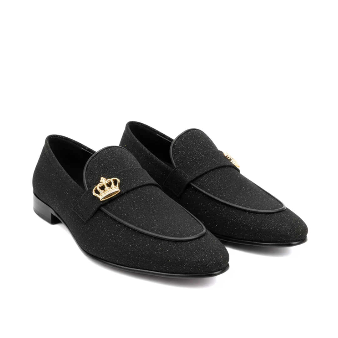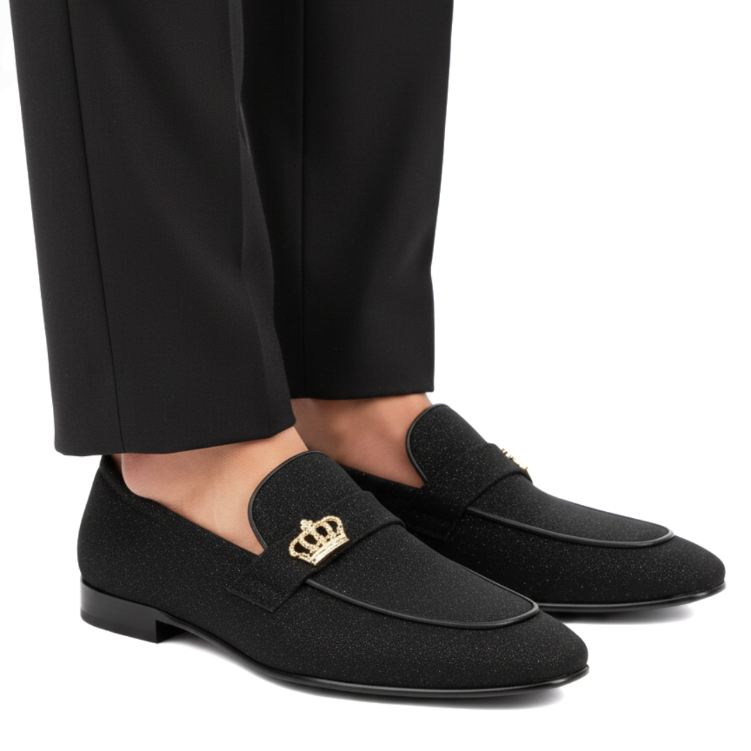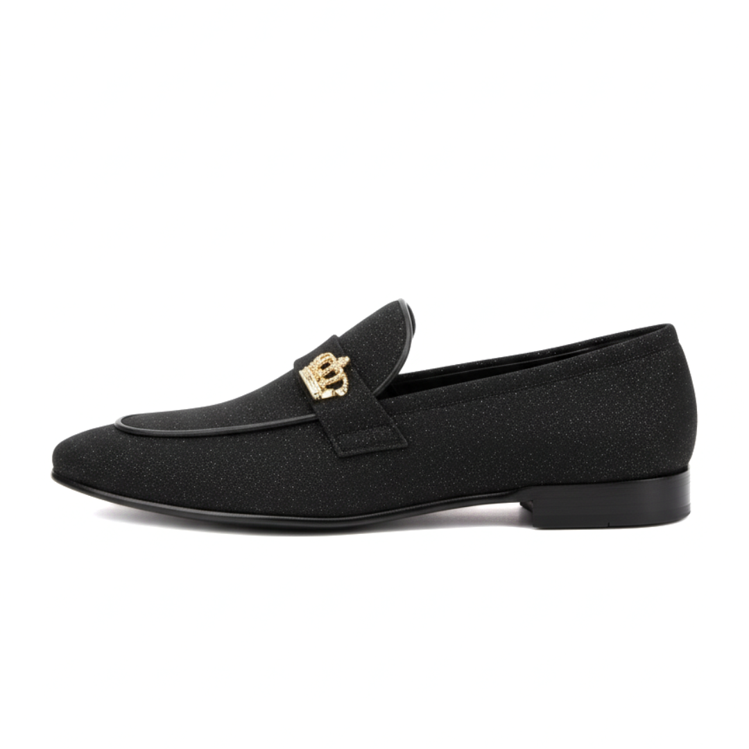 Elevate your footwear collection with these exclusive black shoes, meticulously crafted for individuals who appreciate a blend of elegance and modernity. The shoes feature a smooth black exterior contrasted by a vibrant red interior lining, ensuring a sleek yet comfortable fit. What truly sets these shoes apart is the distinctive gold lion emblem adorning the strap, symbolizing power and luxury. The shoes also boast a specially designed durable sole with intricate patterns, providing excellent grip and stability for everyday wear.